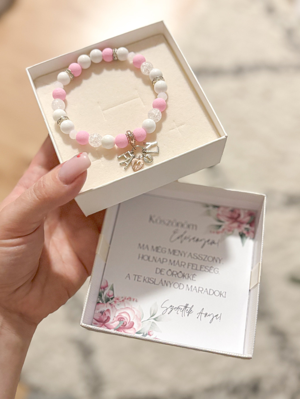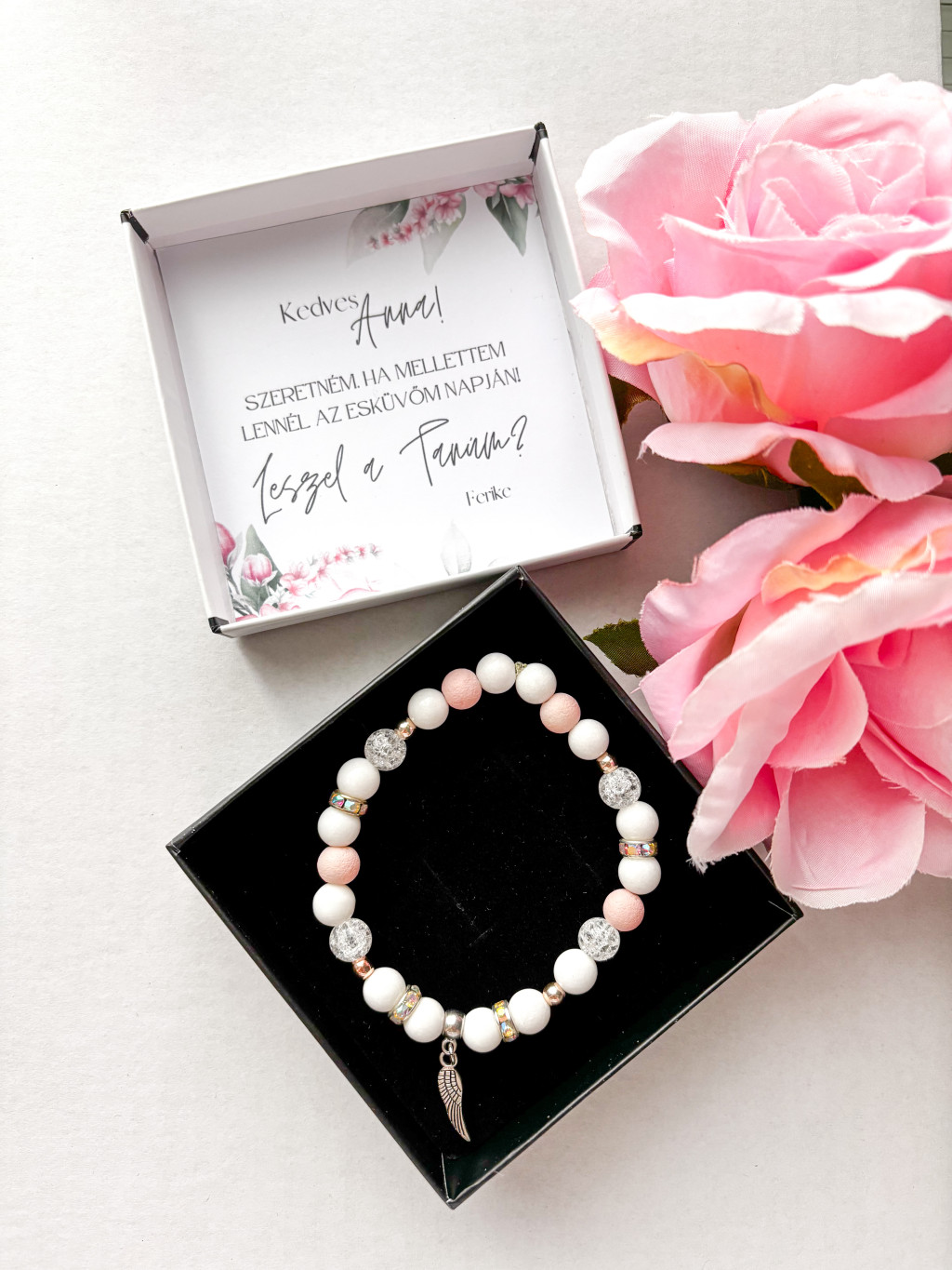 A karkötő mellé kiskártya is tartozik, amelyre egyedi szöveg kérhető, így még személyesebb üzenetet adhatsz át szeretteidnek.