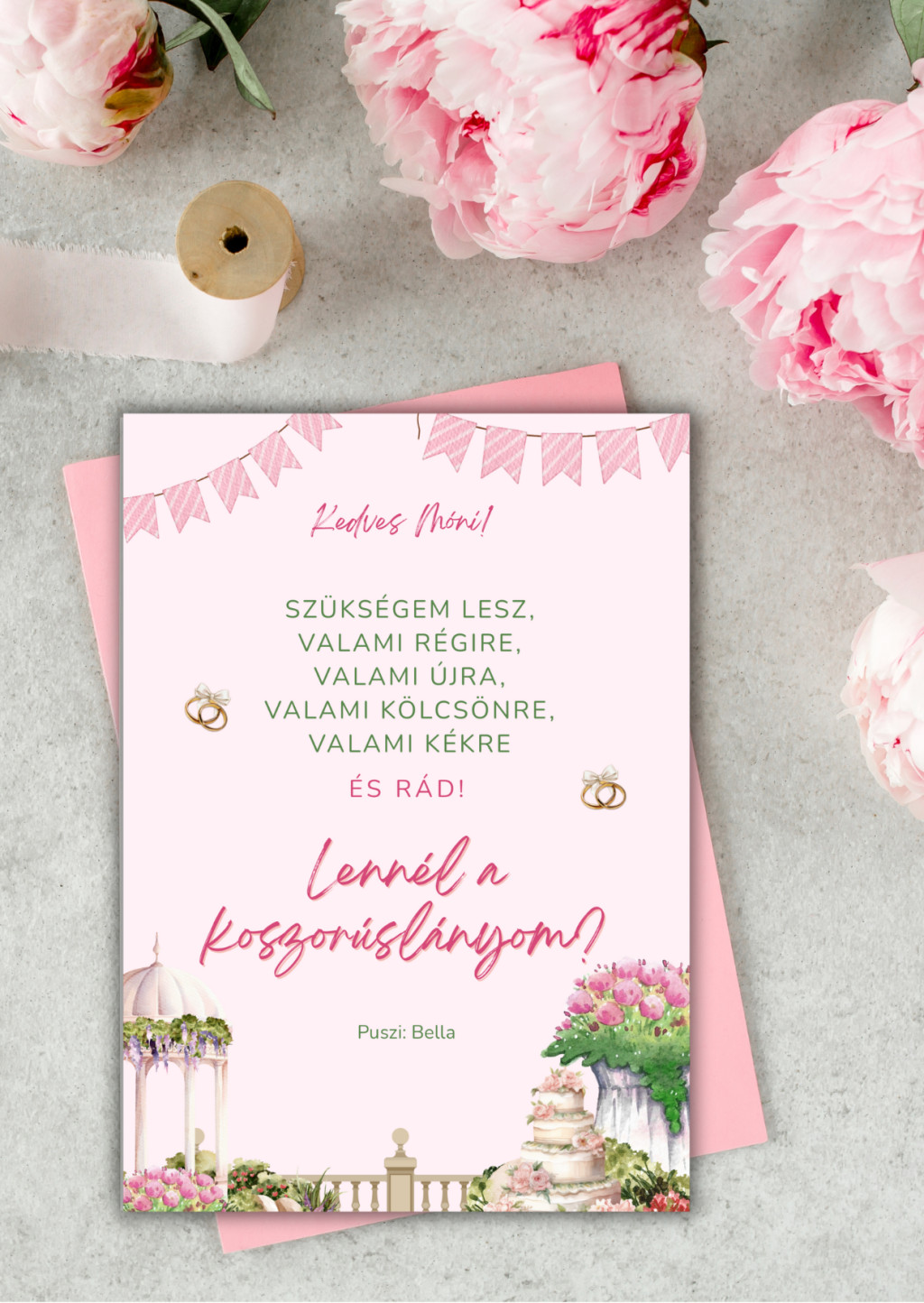“Rózsaszín esküvő” Tanú vagy Koszorúslány felkérő kártya + boríték A6