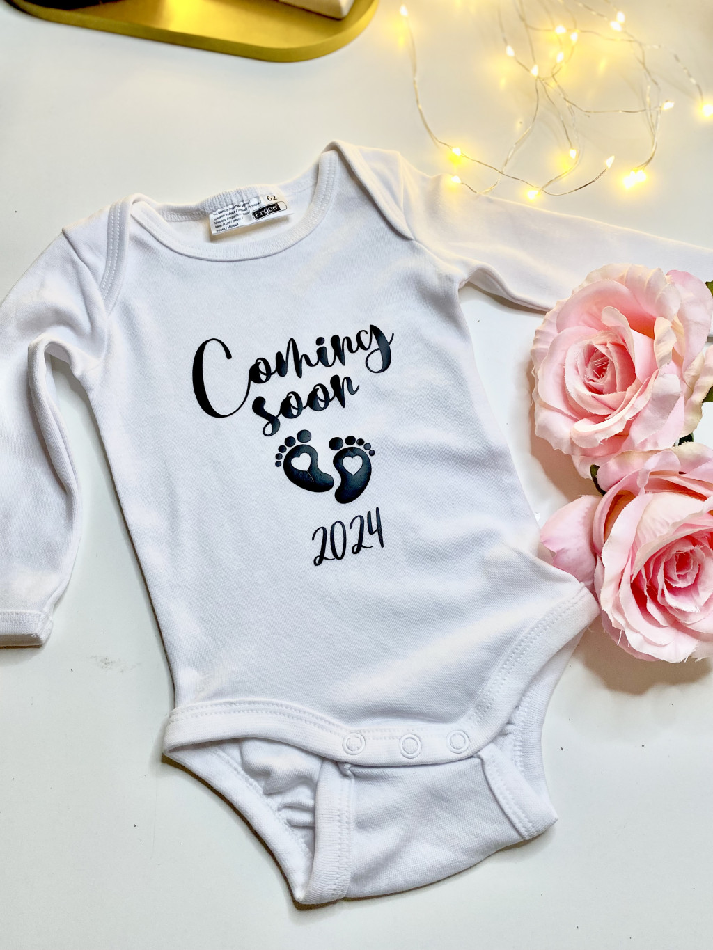 A „Coming Soon” felirat finoman utal a kis jövevény érkezésére, így ideális fotózáshoz, ajándéknak vagy meglepetés bejelentéshez.