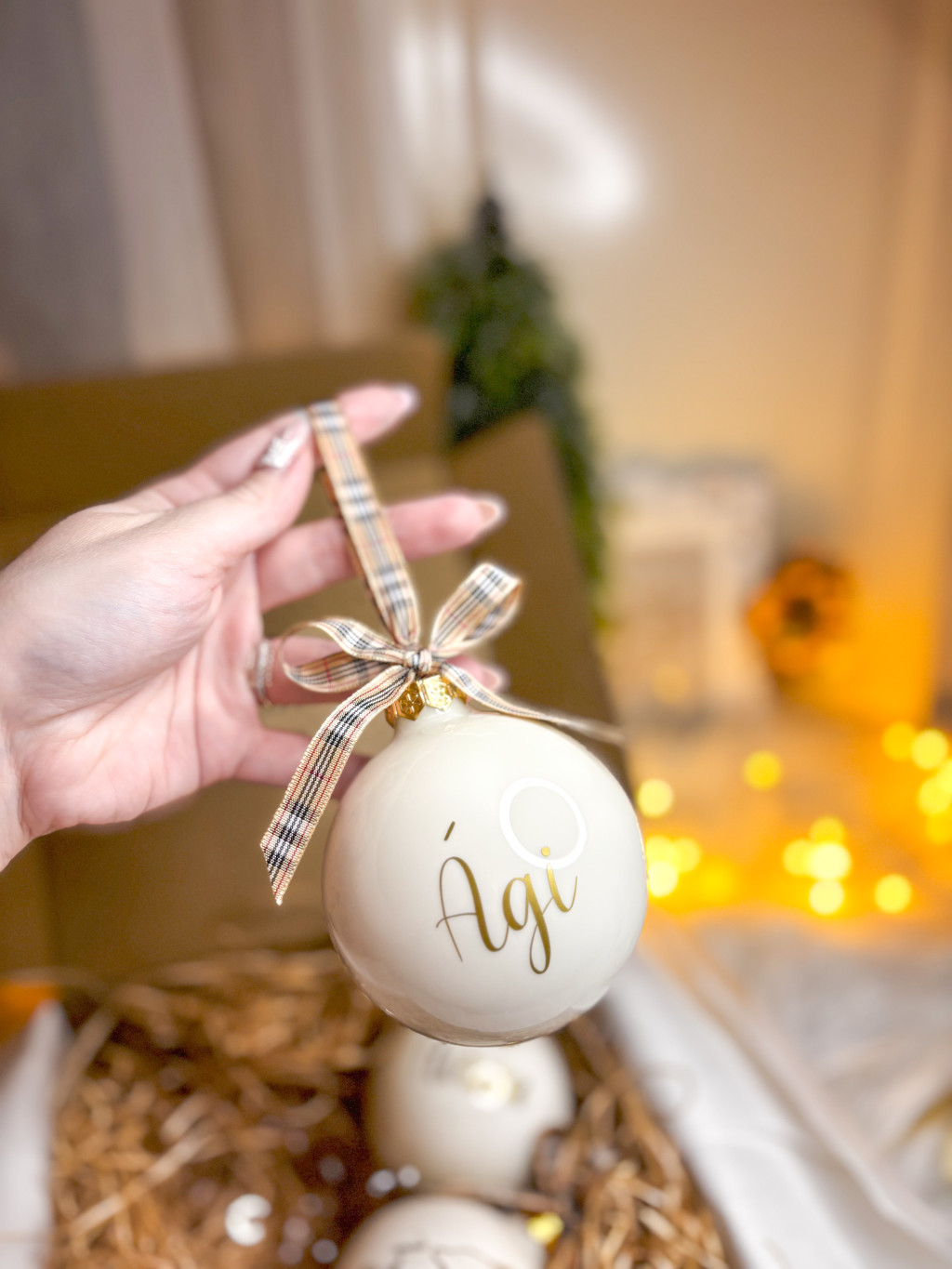 WOOL WHITE - Karácsonyi gömb (névre szóló, egyedi felirattal) 8 CM