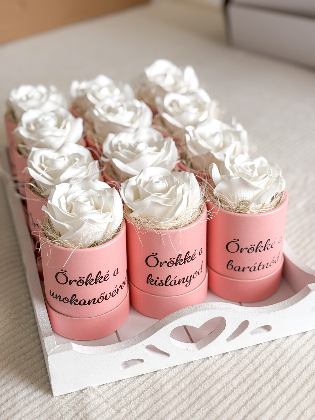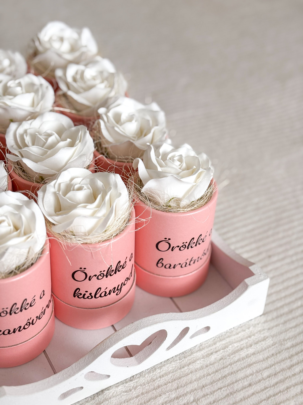 Mini szappanrózsa box – rózsaszín dobozban, egyedi felirattal (5 × 10 cm)