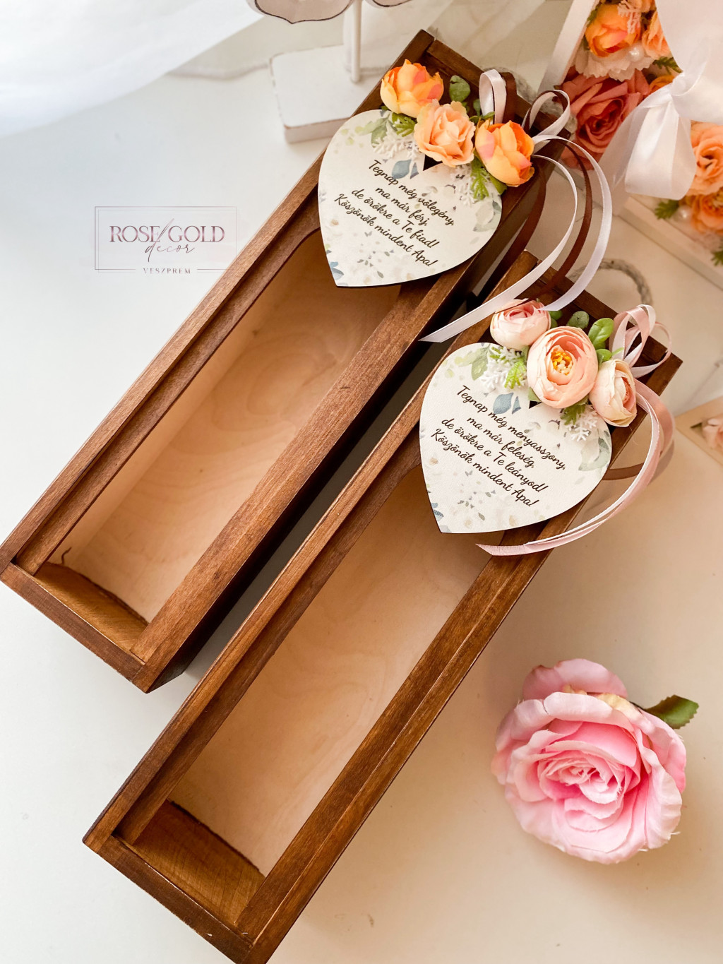 Fa bortartó doboz, Szülőköszöntő felirattal, sötétdió színűre festve - elegáns hatást kelt.