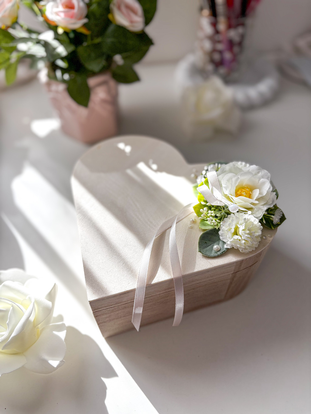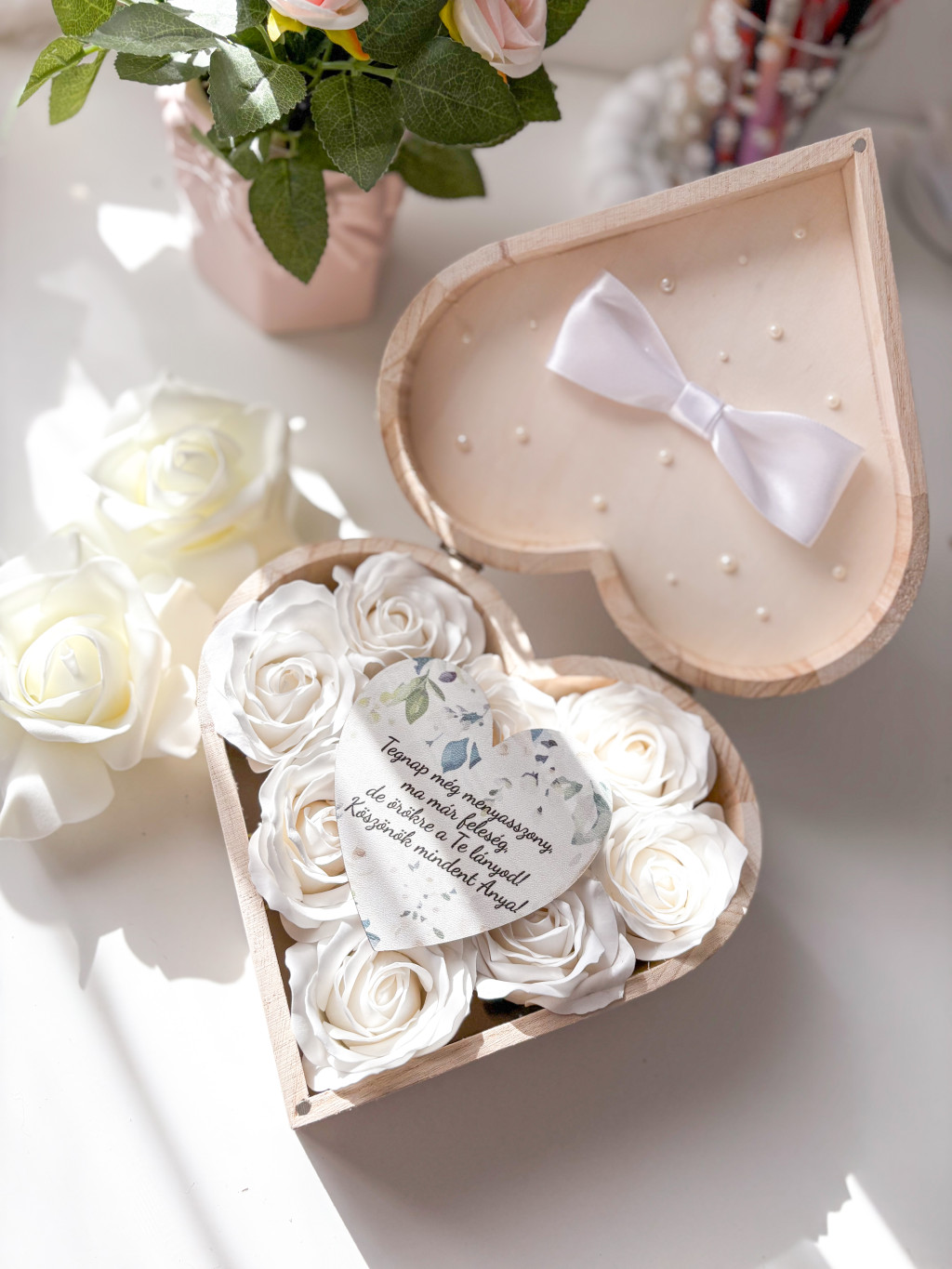 Szív fadoboz fehér rózsákkal – Szülőköszöntő ajándék
