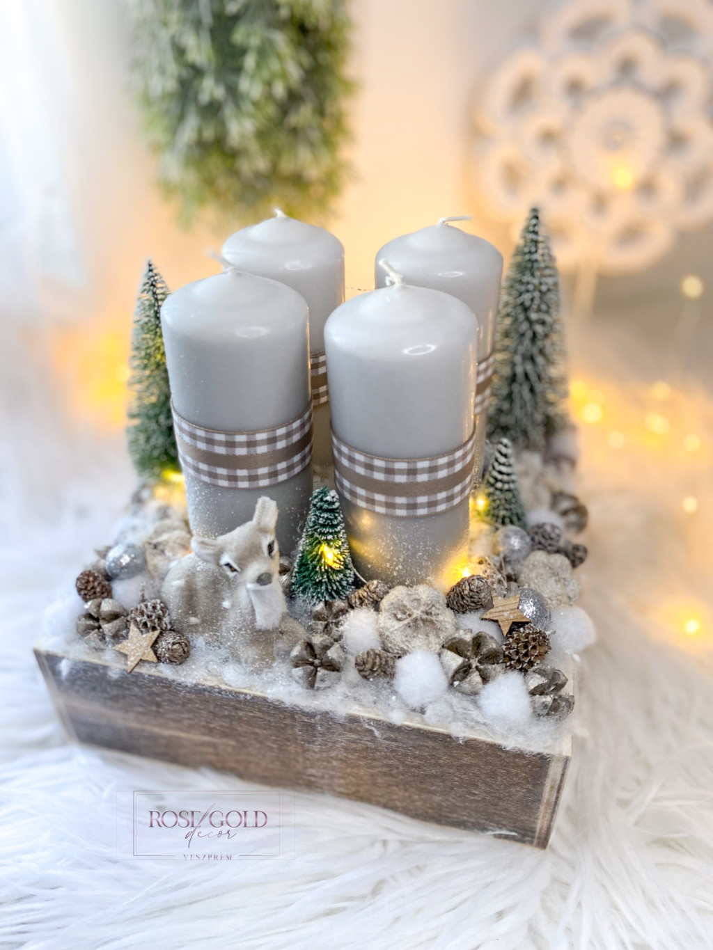 Szürke-fehér őzikés szögletes adventi tál/koszorú 20x20x23cm