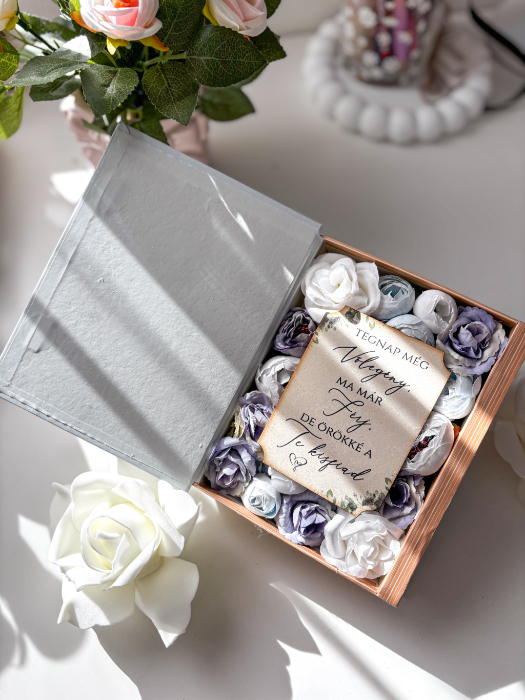 Egy igazán különleges és érzelmekkel teli ajándék, amellyel méltó módon köszönhetitek meg az édesanyáknak mindazt a szeretetet és gondoskodást, amit az évek során kaptatok. Ez a virágmintás, könyv formájú díszdoboz elegáns megjelenésével és megható idézetével örök emlékké válik az esküvő napjáról.