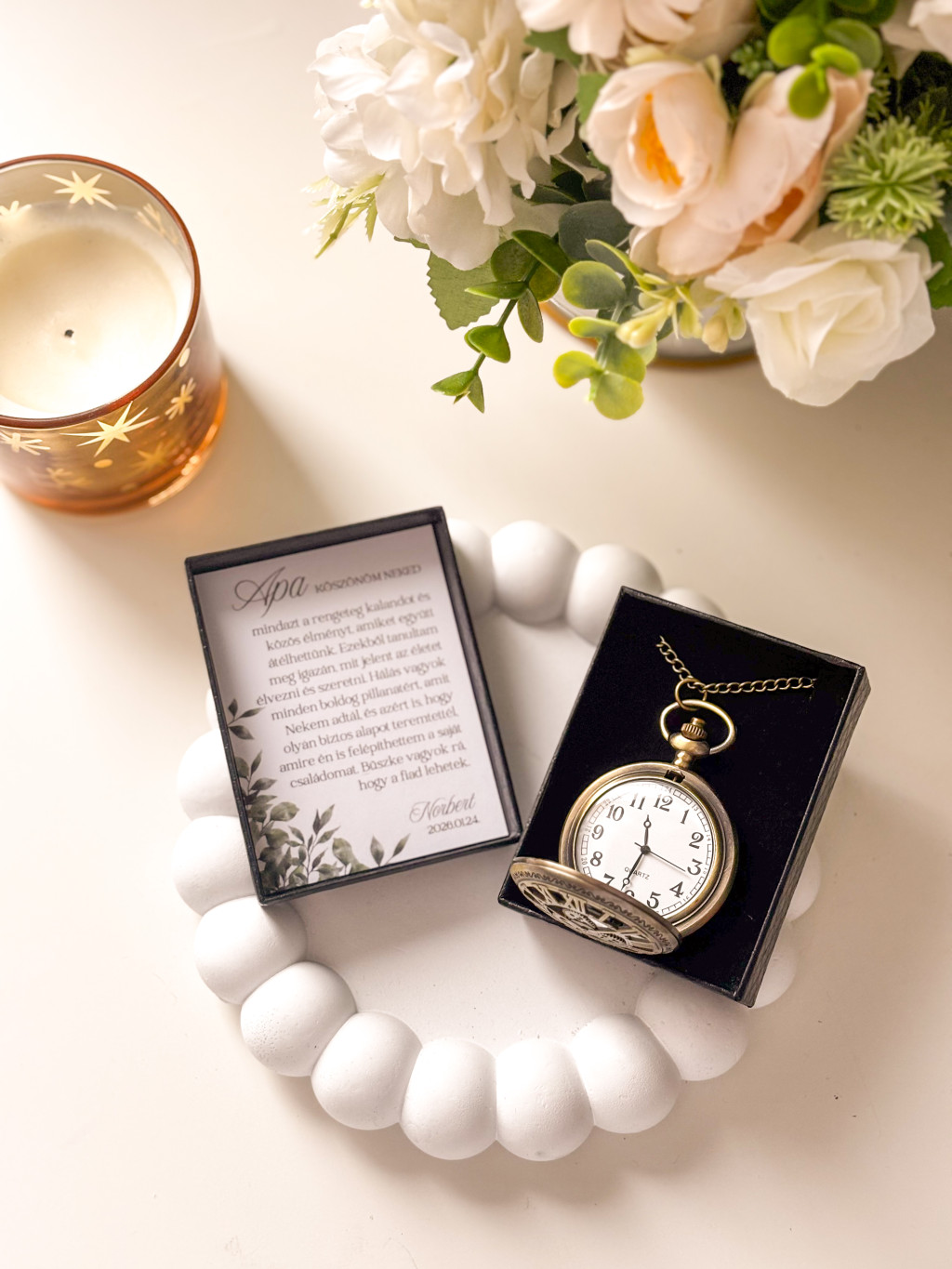 Különleges és időtálló szülőköszöntő ajándék apukáknak és nagypapáknak, amely az együtt töltött értékes pillanatokat szimbolizálja. A vintage zsebóra elegáns megjelenésével, és kedves üzenetével igazán megható emlék.
