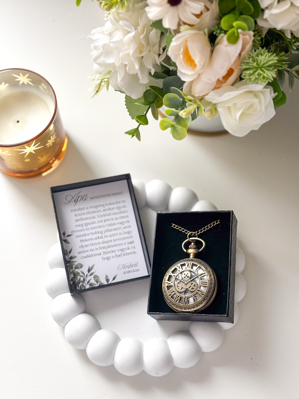 Szülőköszöntő ajándék – Vintage zsebóra egyedi felirattal, díszdobozban