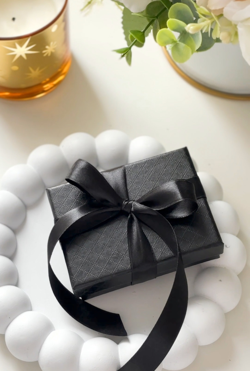 A termék fekete díszdobozban érkezik (10 × 8 cm), szatén szalaggal átkötve, így azonnal átadható elegáns formában.