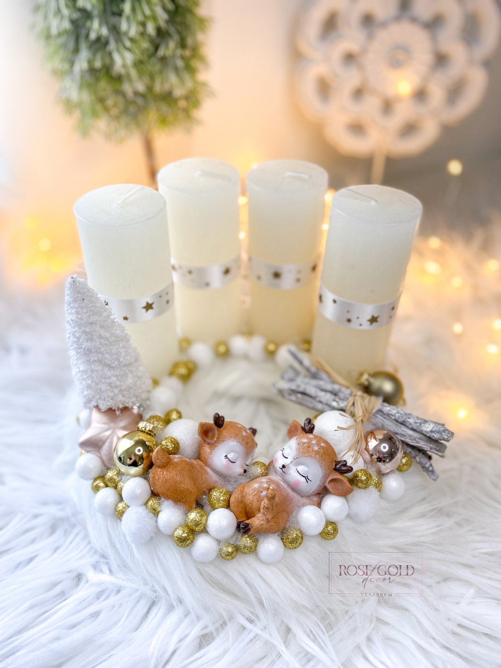 Műszőrme alapon, Bambis adventi koszorú 24 cm - fehér-arany-rosegold