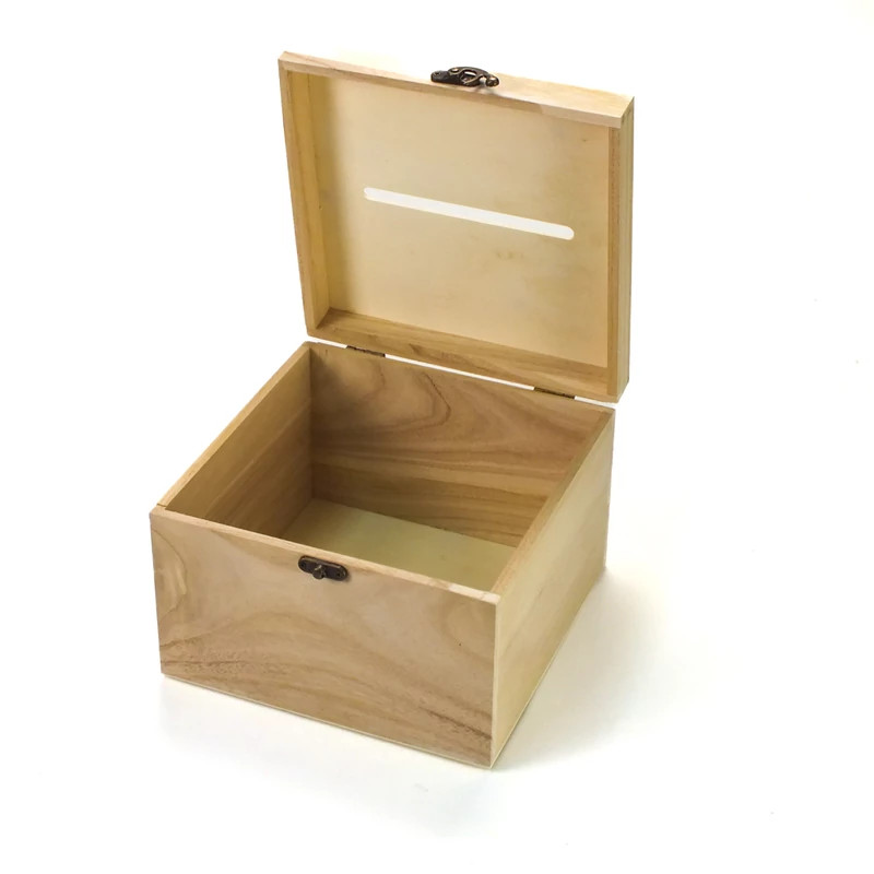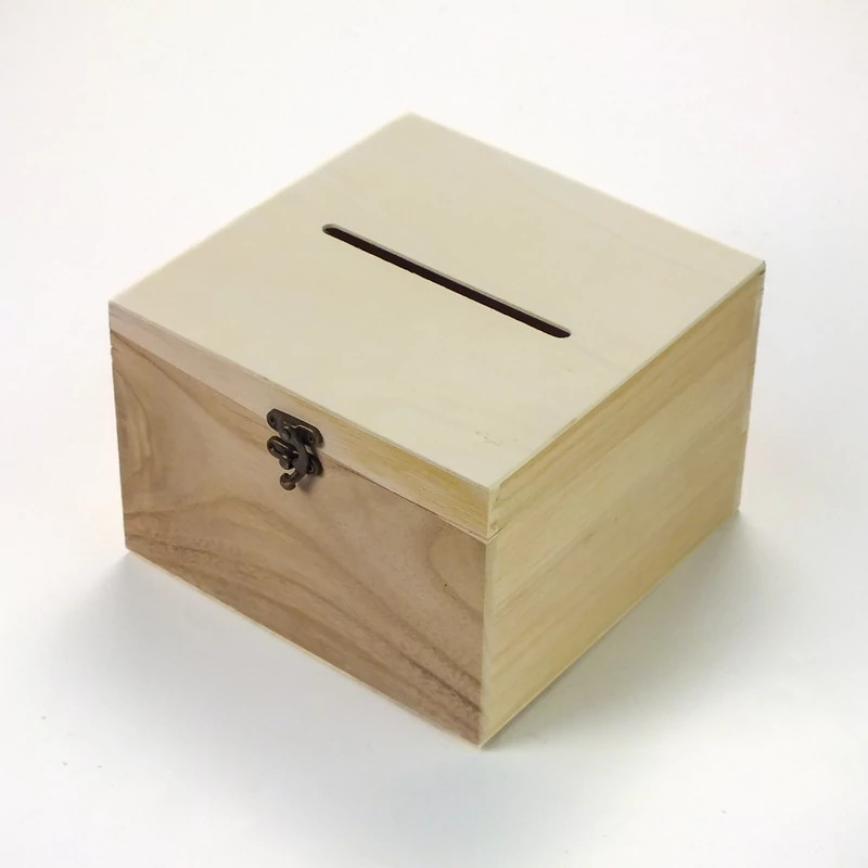 Kocka formájú, natúr fából készült esküvői/lakodalmi díszíthető persely.
